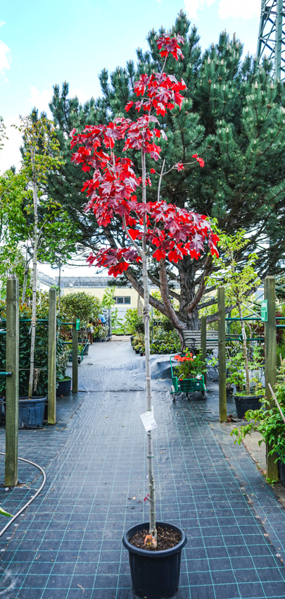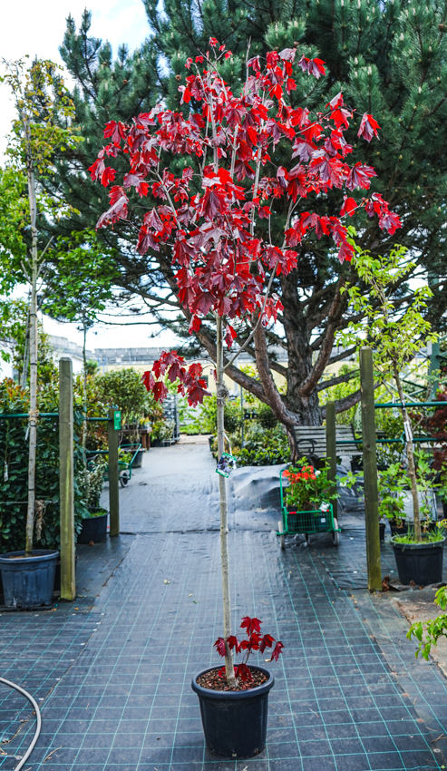 Royal Red is a majestic looking Norway maple for large gardens, parks, and city avenues. Its palmate leaves are dark crimson red, almost black, and glossy, turning amber orange or orange-red in autumn. In spring, just as leaves emerge, it flowers profusely with many small yellow flowers, typical for many Norway maples.