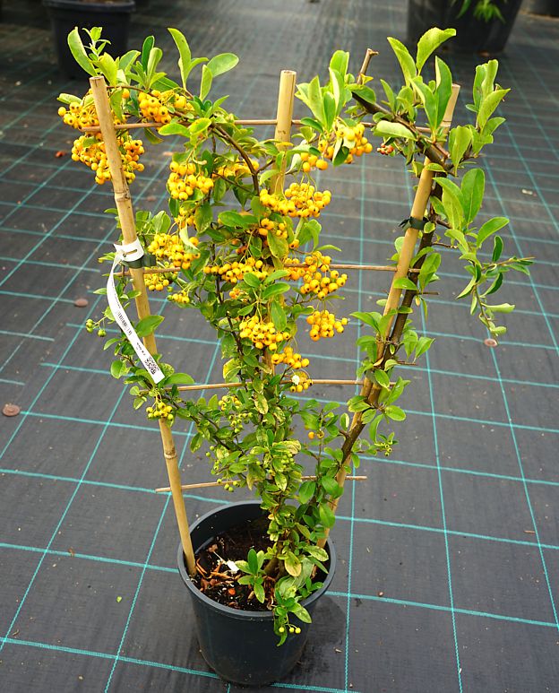 You can grow firethorn as an upright shrub, trim it into a hedge, or shape it. It is not a climber so needs no support, nevertheless we suggest staking young plants to train a terminal leader. It flowers in June and produces berries on 2-years-old wood (previous year’s) so trimming should be done in early to mid-summer to avoid cutting all flowering branches.