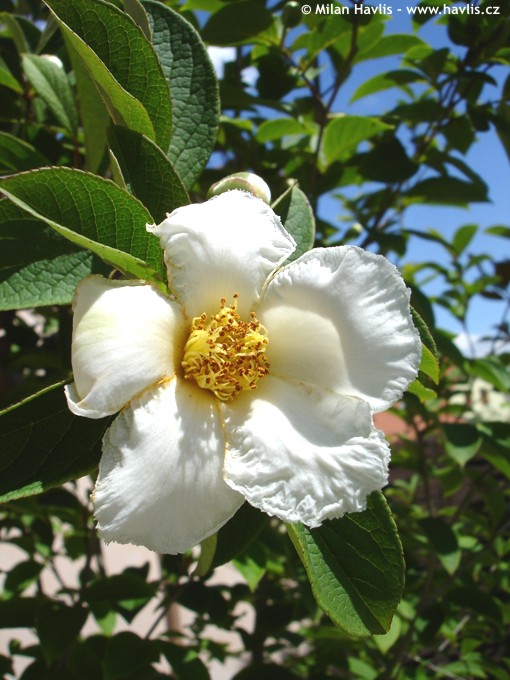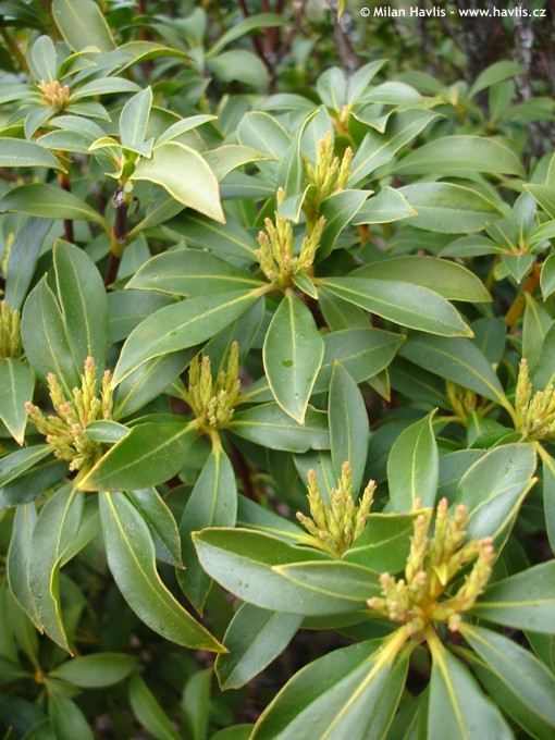 Dalším zástupcem parádivých keřů, které na zimu neshazují listy, je tato vonokvětka. Zralé listy jsou napodzim a v zimě středně zelené s béžově žlutým melírováním.