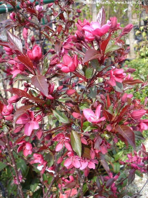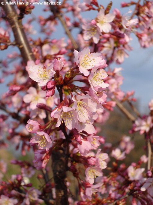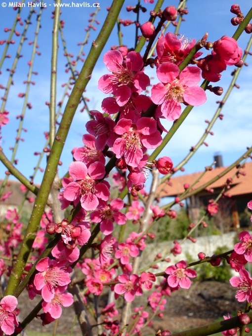 Jak všichni zahradníci vědí, nejdříve mezi všemi prunusy rozkvétají některé ranné slivoně a meruňky. Ať už jedlé nebo okrasné. A tato japonská meruňka je nádherným zástupcem těch okrasných. Až dechberoucí odstín sytě šarlatově růžových květů, které jsou bez stopek hustě posety kolem větviček. Až bude rozkvetlá celá koruna stromu, ukážeme další fotku. Zatím jenom malá ochutnávka prvních květů.