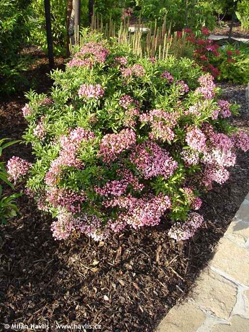 Nesmírě bohatě kvete tento pomalu rostoucí pieris.