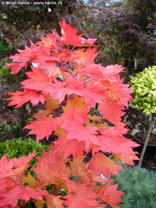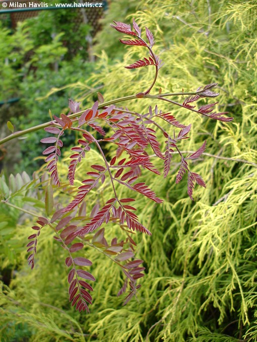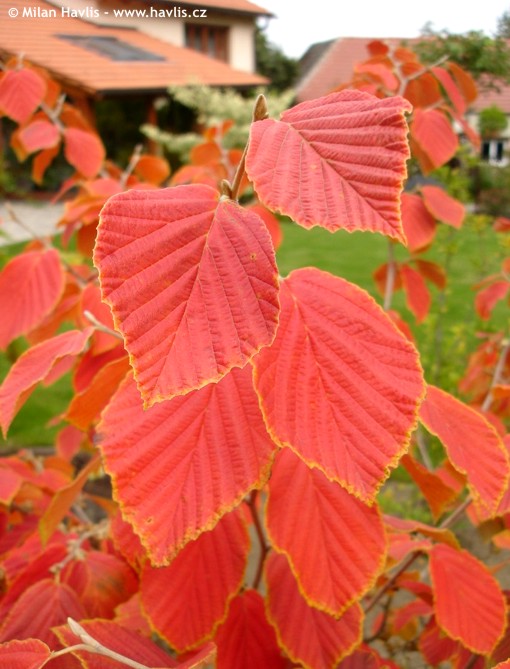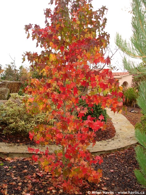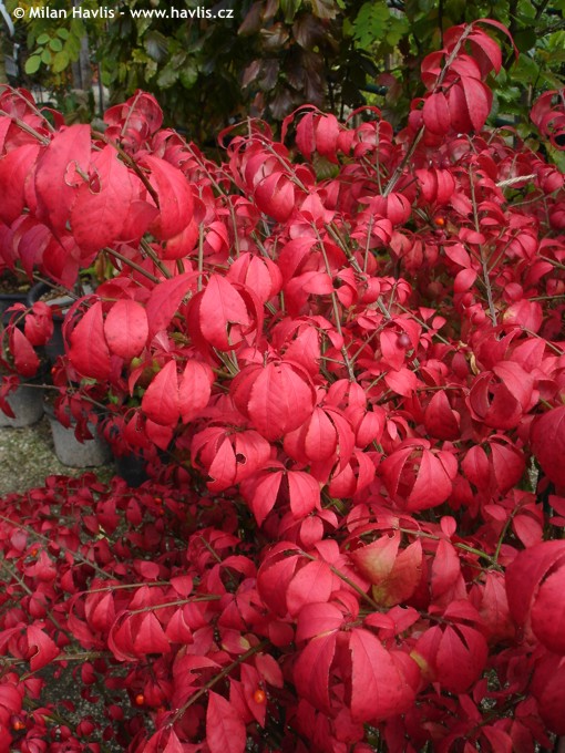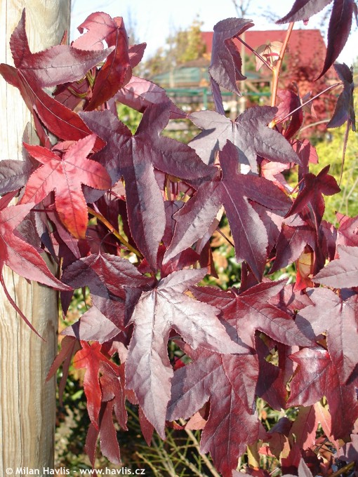 V létě zlatozelené listí se na zimu barví do šarlatově červených a růžových odstínů.