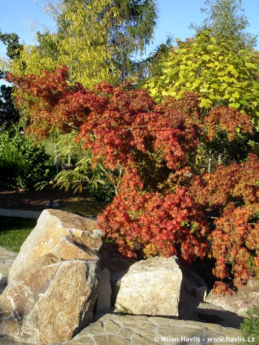 Na podzimu jsou krásné nejenom jeho barvy, ale i s nimi spojená proměnlivost. Na obrázku je strom růžové sakury Kanzan, který mám přímo pod okny ložnice. Každé ráno se na něj podívám a každé ráno je jiná. Ještě včera byla spíše do ruda, dnes je již ohnivě oranžová. A za pár dní se změní ve zlatožlutou a listy začnou houfně opadávat, takže na sytě zeleném trávníku (díky teplému a slunečnému počasí) budou tvořit nádherný kontrast. A schválně je necháme ležet a neshrabeme, než ztratí barvu. Vždyť i trocha barevného odpadu může podzimní zahradu rozveselit :-)