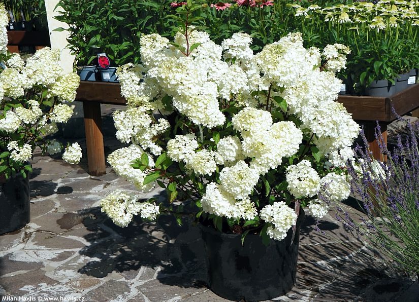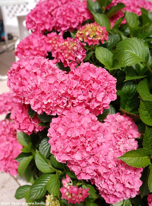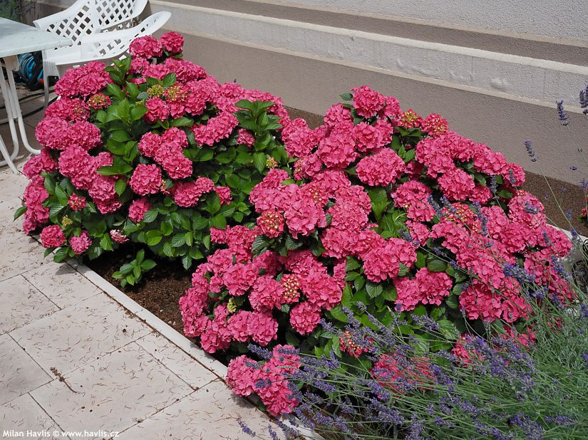 hortenzie velkolistá Leuchtfeuer drze umístěná téměř na plném slunci pouze s ochranou proti polednímu žáru a s notorickou zálivkou to zvládá