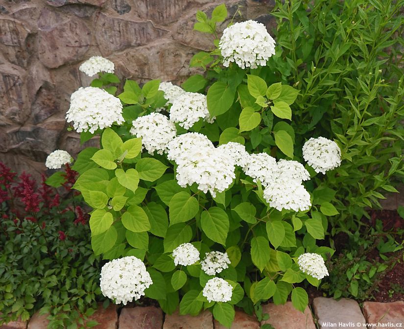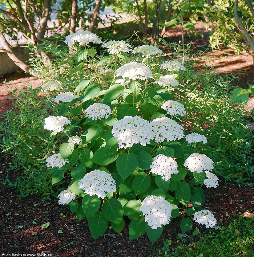 a druhá drzost - slunce milující hortenzie stromečkovitá Strong Annabelle testovaná naopak v plném celodenním stínu se chová, jako by se nechumelilo (naštěstí se vážně nechumelí)