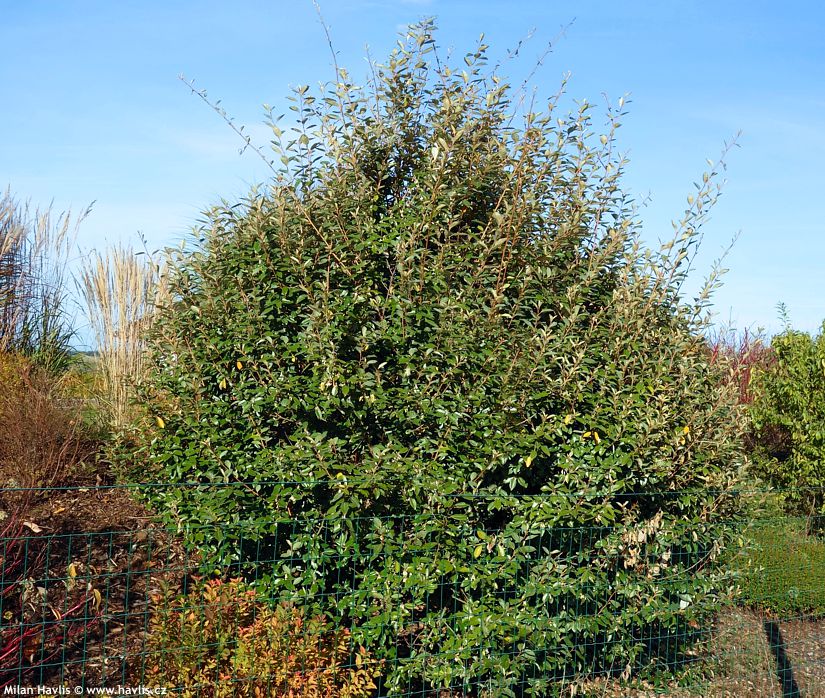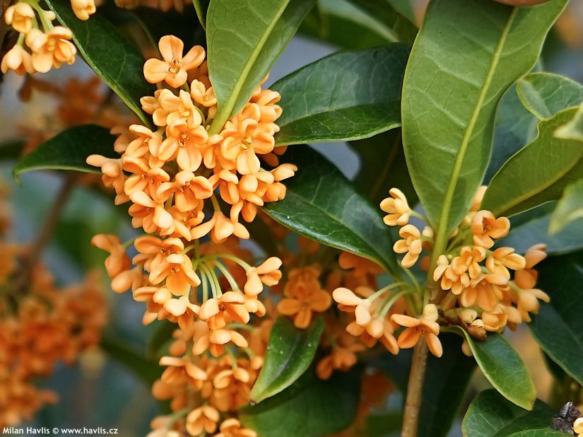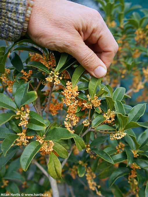 Tahle stálezelená nádhera se celým jménem jmenuje osmanthus fragrans var. auranticus, má neopadavé listy s hladkými okraji (bez ostnů) a na podzim kvete záplavou sytě oranžových květů, které sytě a sladce voní po pomerančích a mandarinkách. Něco skvostného.