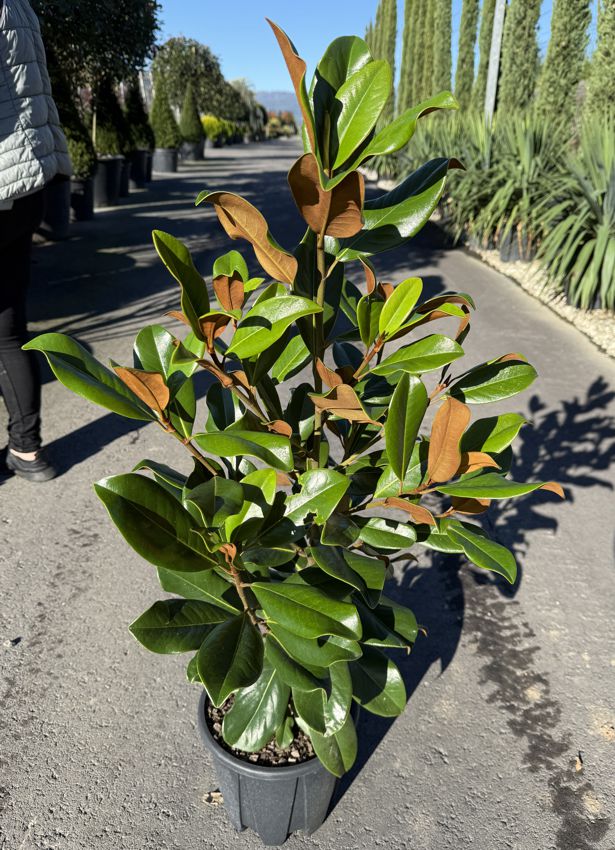 Listy jsou neopadavé, středně až tmavě zelené, mírně lesklé, velmi pevné, kožovité, pokryté rezavým semišem zespodu. Roste poměrně rychle a tvoří jednoleté výhony o délce 30-40 cm. Tvar keře je typický pro všechny magnólie – široký plamen svíčky. Střih se obyčejně nedoporučuje, neboť vyžaduje trochu obezřetnosti. Přesto, pokud máte menší zahradu a chcete keř udržet menší, můžete dlouhé, jednoleté výhony, jež nemají květové poupě, až o polovinu zakrátit co nejdříve zjara po odeznění mrazů. Pokud mají květové poupě (je o poznání baculatější a kratší než podlouhlý listový pupen), větev zastřihněte těsně po odkvětu. Vřele doporučujeme každoroční pohnojení „šokovou“ dávkou kvalitního, ve vodě rozpustného hnojiva (např. Kristalon Gold), kdy použijete cca desetinásobek doporučené dávky a rozmícháte jej v desetilitrové konvi a rostlinu velmi pomalu zaléváte, aby vše vypila. Tuto výživu můžete provést kdykoli od května do poloviny července, stačí 1x ročně. Do 7-10 dnů listy ztmavnou do sytého, zdravého odstínu a do 3 týdnů jí narostou nové listy i výhony.