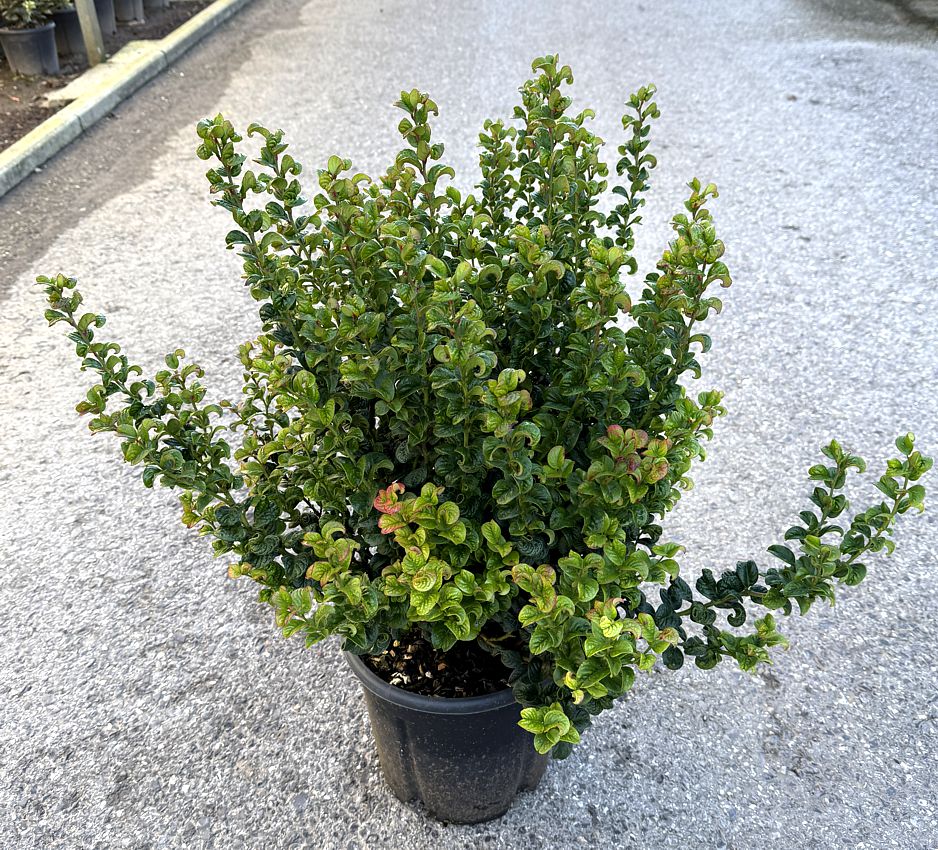 Curly Red® je stálezelený nižší keřík kompaktního růstu, jehož hlavním atributem jsou půvabně kudrnaté, velmi lesklé listy. Jejich barva je svěže zelená, když raší, zraje v tmavě zelenou a na podzim nabírá nádech tmavě vínové a s příchodem čím dál chladnějšího počasí se celá rostlina zbarví do purpurově vínové a vydrží tak až do jara. Pokud je vysazena na plném slunci, získá vínovou barvu na koncích listů již od druhé poloviny léta.