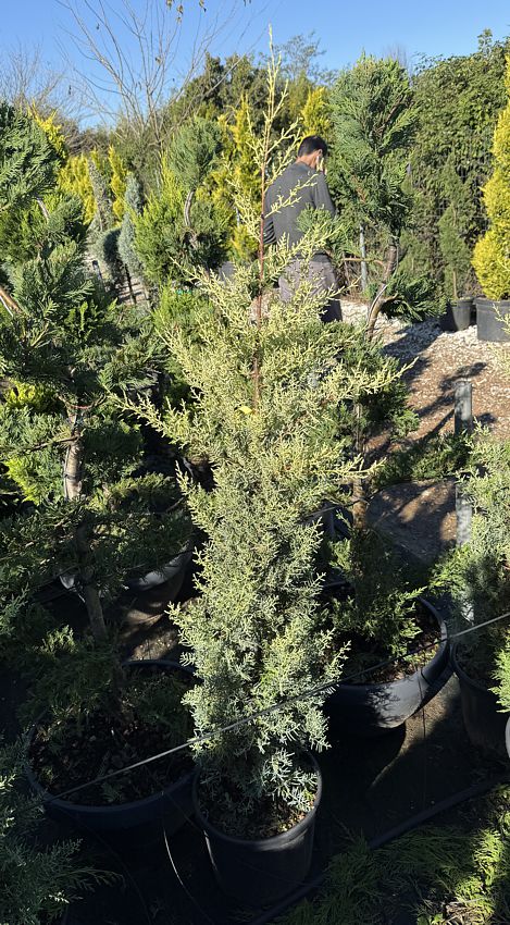 In landscapes it acts as a slim vertical accent that stands out thanks to its unique coloration. Its pale-yellow tones harmonize with almost any colour scheme – from dark-leaved shrubs to classic rhododendrons or cherry laurels with green foliage and brightly coloured flowers. We have used it in a Mediterranean-style landscape with drought-tolerant shrubs from the olive family (such as Phillyrea, Osmanthus, and Olea), and the result was stunning! In more traditional European gardens, it pairs beautifully with red-leaved deciduous trees and bluish conifers. It fits well into formal landscapes, modern plantings, or as a solitary specimen in naturalistic compositions. Pruning begins in late spring and can continue until mid-autumn but avoid cutting into older wood – not only will bare branches fail to regrow, but they also release sticky resin that remains soft for a long time and can easily stain clothing.