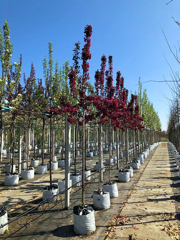 Apple trees will grow in most soils but do best in well-drained but evenly moist, fertile, preferably acid soil for best autumn colours. They don’t like road salt. When planting it, make sure the root-ball is well soaked with water and trees with trunks need to be staked to a strong support for at least 3 years after transplanting. Fully hardy to min. -29 °C (USDA zone 5).