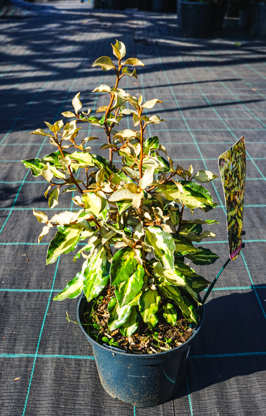 MARYLINE® is a trade name for a striking selection of evergreen silverthorn, found by Albert Breneliére in France. It is a very bushy, upright growing, evergreen shrub with irregularly variegated leaves. They are leathery, oval to ovate, partially undulated, and glossy. The centres are very pale yellow maturing to deeper yellow, margins dark green, and between margins and centres are some light green highlights which make the leaves look extremely fresh and colourful. Newly emerging leaves are silvery-beige. Twigs are orange-brown and the colder weather comes in autumn the deeper the colour gets.
