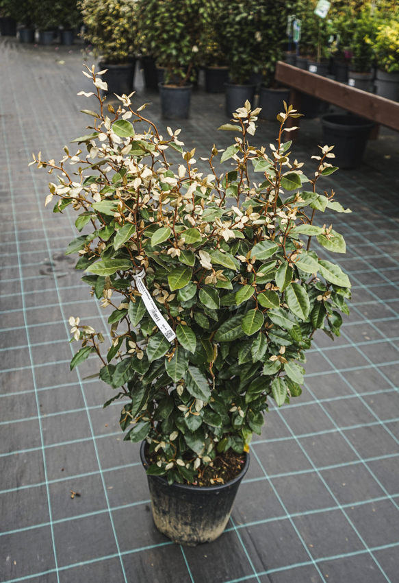Evergreen silverthorn is a natural hybrid of e. macrophylla with large, evergreen, rather rounded leaves and vigorously growing e. pungens with narrower foliage and thorns. It is sometimes called Russian olive which is not correct as this name is already used for its deciduous sister e. angustifolia. It is described to have been discovered by a Dutch horticulturist Simon Doorenbos (1891-1980) who named it after another Dutch botanist J.W.E. Ebbinge in 1929. However, many years later it was pointed out that a Swiss botanist Camille Servettaz (1870-1947) found this mutation, too, and named it elaeagnus x submacrophylla already in 1909. In spite of that, the whole horticultural world still sticks to e. x ebbingei and we do, too, if you don’t mind.