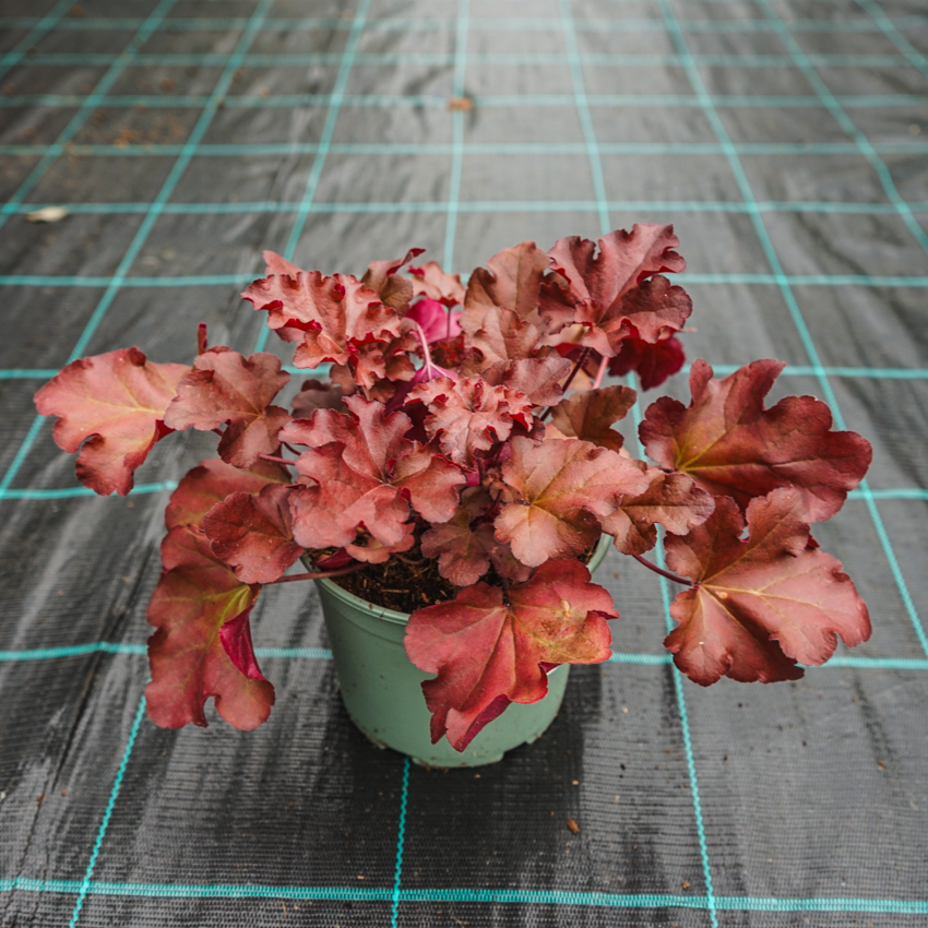 Another berry-licious coral bells variety is called Boysenberry. It produced large, ruffled, caramel-red leaves which are very resistant to both sun and frost, therefore will look nice also through mild winters until spring. The undersides are rich salmon pink. Small, white flowers are composed in erect panicles atop straight, about 30 cm tall, dark red stems from early summer onwards. They can be cut off if only beautiful foliage is what you desire. The plant makes compact, upright tufts. Represented by Gootjes AllPlant BV in Europe.