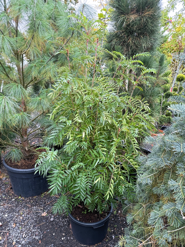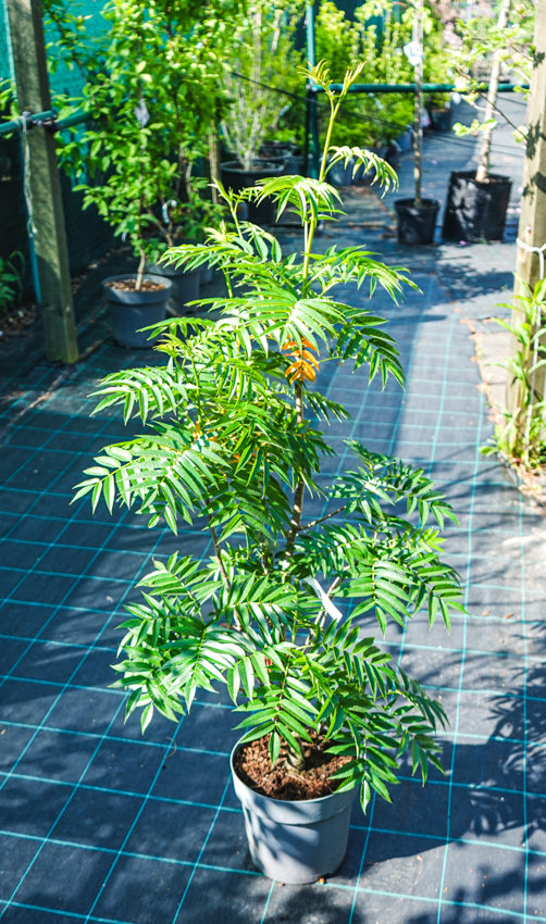 Dodong is a rowan variety grown for its attractive foliage and fruit. The pinnate leaves are up to 25 cm long and composed of 15-17 lance-shaped, tapered, mid green and glossy leaflets. In autumn, they gradually turn fantastic shades of golden yellow, amber orange, and fiery red.