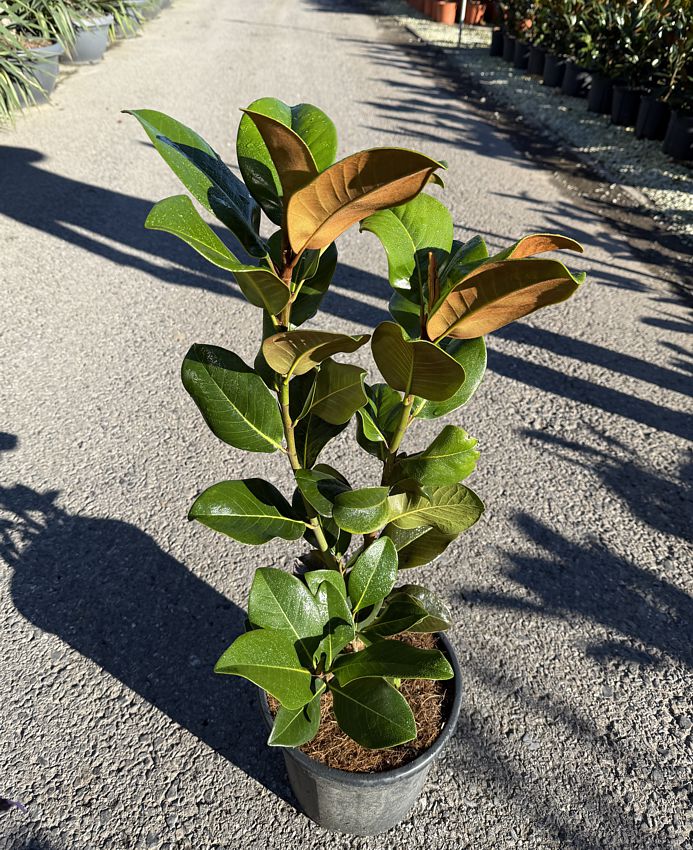 Southern magnolia is very hungry. It needs acidic, fertile, reasonably drained but not purely sandy soil. Clay in lower parts is beneficial. We strongly suggest using mycorrhizal fungi for its roots, they work miracles especially for large plants whom they help establish without any signs of defect. Now bring your attention to fertilizing, most importantly during its first three or four years after transplanting it needs regular feeding in order to keep all its foliage and to produce flowers freely. Use any sort of fertilizer for ericaceous plants and apply it according to instructions from May until late July. Keep the plant’s roots constantly moist during this period and don’t forget to water it also in winter when the ground is not frozen. Then it will fully establish and will not suffer from summer droughts and will not need extra feeding as its roots will be deep enough to find their own food. Choose only sunny locations, possibly with winter shade that may be welcome in areas with long-lasting winters. Extremely hardy to -31°C (USDA zone 5a) for a limited period of time, and generally suggested for zones 5b and higher.