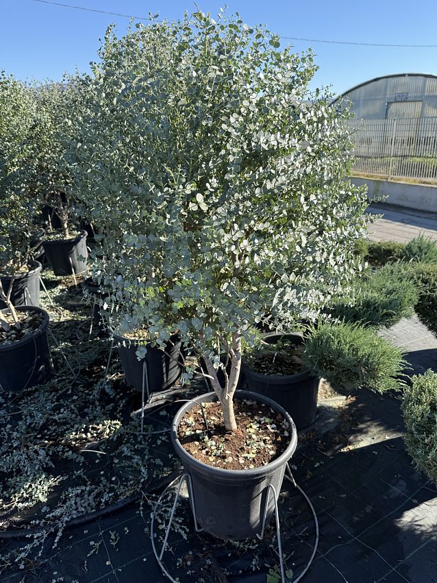 As for the size of AZURA, it is fair to say that we are sailing into uncharted waters. All previous ideas about how large Eucalyptus gunnii can grow in cooler climates (Central and Northern Europe) are based on non‑hardy plants that lost something every winter – the leader, branches, sometimes the entire above‑ground part. If frost ceases to be a limiting factor, as seems to be the case with this cultivar, it makes sense to expect a completely different scenario. Healthy, well‑established plants grow very fast, easily around one metre per year, and there is no reason to assume that their height should stop at the previously quoted figures of around four to five metres. Although this is still an expert estimate based on experience and growth logic, it is already clear that AZURA is vigorous and not inclined to stop easily. So, if the botanical species has the capacity to reach around ten metres, there is no reason to believe that AZURA must remain smaller. But don’t worry if that feels like too much – its growth is fully under your control. Spring pruning after frost keeps it compact, dense and shrub‑like, while leaving it to its own devices allows it to grow more freely and eventually develop into a taller, multi-stemmed or tree‑like form. It is entirely up to you how much space you give it and how you want its story to unfold.