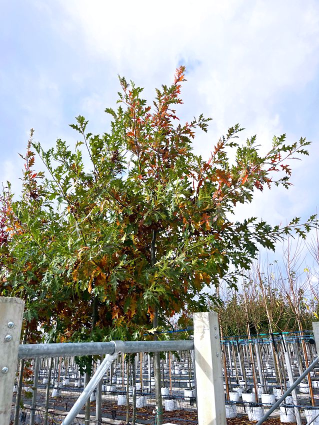 New Madrid is a hybrid Nuttall oak variety, a cross between q. nuttallii (= q. texana) and q. palustris. It is a little smaller than the species, yet a large tree for mid-sized gardens and parks. It is renowned for its colourful foliage – in spring the leaves emerge coppery red, in late spring turn maroon or pale chocolate red, and in autumn change to fiery shades of golden, orange, and red. They are deciduous, bright green in summer, deeply lobed, and have bristles at the tips of the lobes. In March appear flowers formed in small, male and female catkins, and are followed by acorn in late summer and autumn the following year.