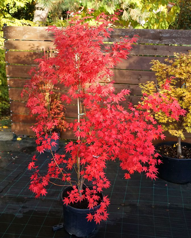 Japanese maples are very decorative and usually low shrubs, occasionally small trees, with attractive foliage and picturesque structure. There are many varieties in various shades of green, chartreuse, golden and yellow, red to maroon, and even multicoloured (variegated). They originate from Asia (Japan, China, Korea), where they have been cultivated for at least two centuries or perhaps even longer, however, they were introduced to Europe only at the beginning of the 19th century, specifically to Great Britain in 1820. Interestingly, the botanist Carl Peter Thunberg described them much earlier, in 1784, because he undertook an expedition to Japan in 1775-1776, discovering new species and collecting seeds and plants. He named the tree Acer palmatum, referring to the leaf shape resembling a human hand with fingers, although it is said that they first reminded him of frog fingers, which is also one of its oldest Japanese names: kaede. The other is momiji (baby hands). The beauty of the colours and shapes of the leaves and trees is reflected in many arts, for example, in the oldest preserved collection of Japanese poetry from the 8th century, the Man'yōshū (Collection of Ten Thousand Leaves). The Chinese poet Wang Wei (699-759) celebrated their beauty in many of his works, and naturally, maples often appeared in ancient paintings, tapestries, porcelain, and wherever classic and traditional decorations associated with the symbolism of these maples were desired: beauty and elegance, serenity, endurance, vitality, and transformation.