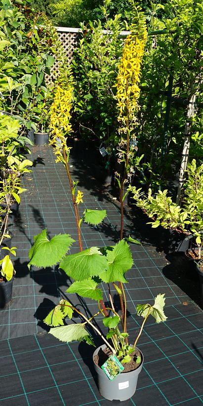 The Rocket is a showcase among leopard plants. It is a hybrid of l. stenocephala and l. przewalski producing glowing yellow flowers on tall stems and attractive leaves. Before the flowers appear the foliage will undoubtfully catch your eyes. The leaves are up to 25 cm across, kidney-shaped, medium green and glossy, conspicuously serrated at margins. They unfold atop about 30 cm tall, deep maroon or almost black stalks, creating clever parasols that completely shade the ground beneath: the plant loves moist sites and parasols prevent the ground from thirsty sunrays, how crafty, eh?