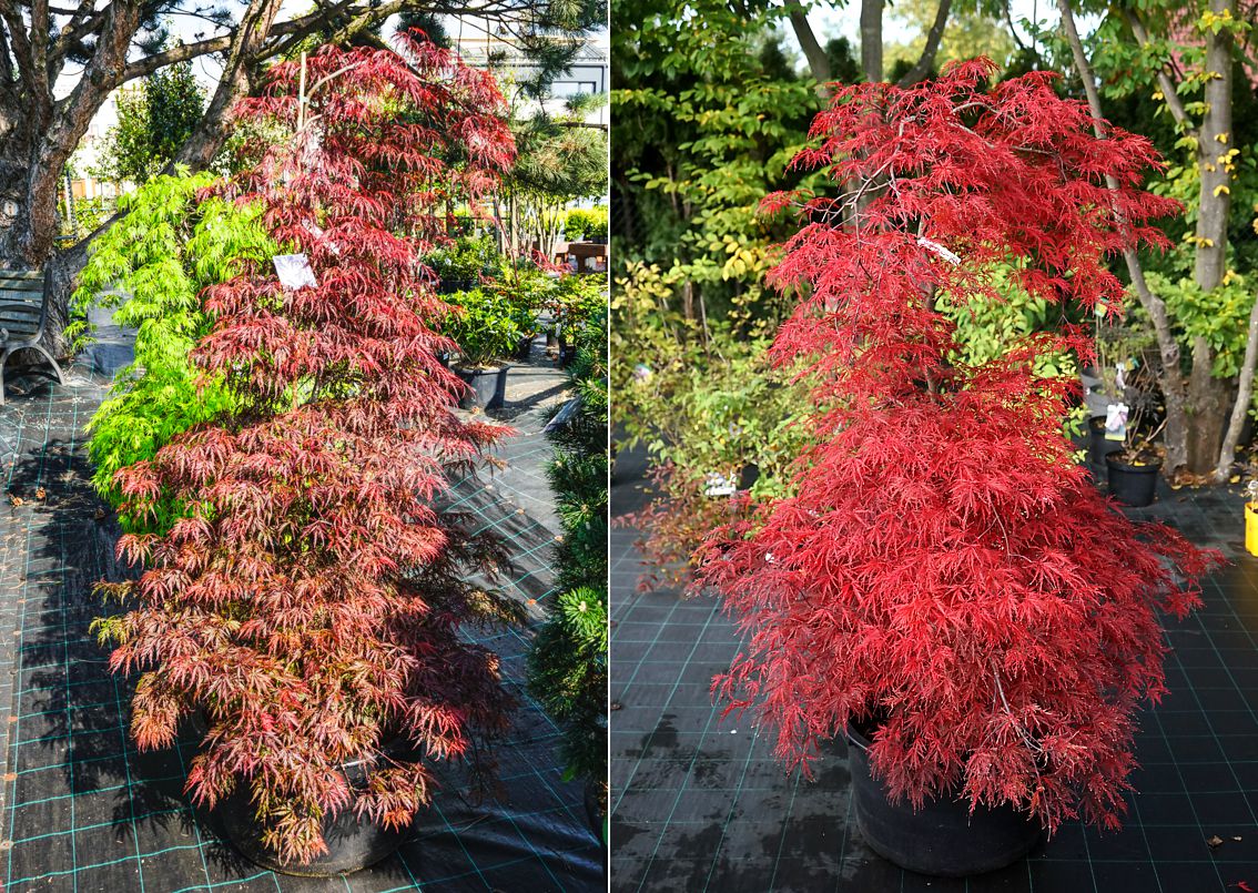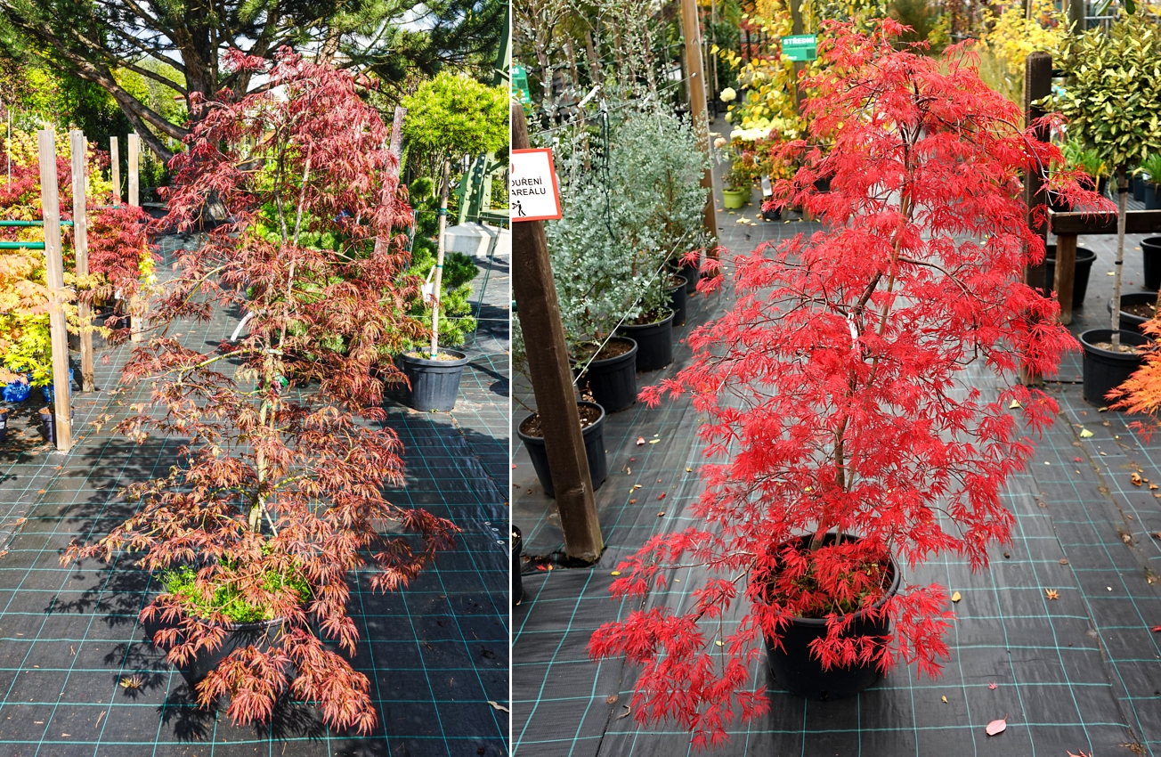 Japanese maples are very decorative and usually low shrubs, occasionally small trees, with attractive foliage and picturesque structure. There are many varieties in various shades of green, chartreuse, golden and yellow, red to maroon, and even multicoloured (variegated). They originate from Asia (Japan, China, Korea), where they have been cultivated for at least two centuries or perhaps even longer, however, they were introduced to Europe only at the beginning of the 19th century, specifically to Great Britain in 1820. Interestingly, the botanist Carl Peter Thunberg described them much earlier, in 1784, because he undertook an expedition to Japan in 1775-1776, discovering new species and collecting seeds and plants. He named the tree Acer palmatum, referring to the leaf shape resembling a human hand with fingers, although it is said that they first reminded him of frog fingers, which is also one of its oldest Japanese names: kaede. The other is momiji (baby hands). The beauty of the colours and shapes of the leaves and trees is reflected in many arts, for example, in the oldest preserved collection of Japanese poetry from the 8th century, the Man'yōshū (Collection of Ten Thousand Leaves). The Chinese poet Wang Wei (699-759) celebrated their beauty in many of his works, and naturally, maples often appeared in ancient paintings, tapestries, porcelain, and wherever classic and traditional decorations associated with the symbolism of these maples were desired: beauty and elegance, serenity, endurance, vitality, and transformation.