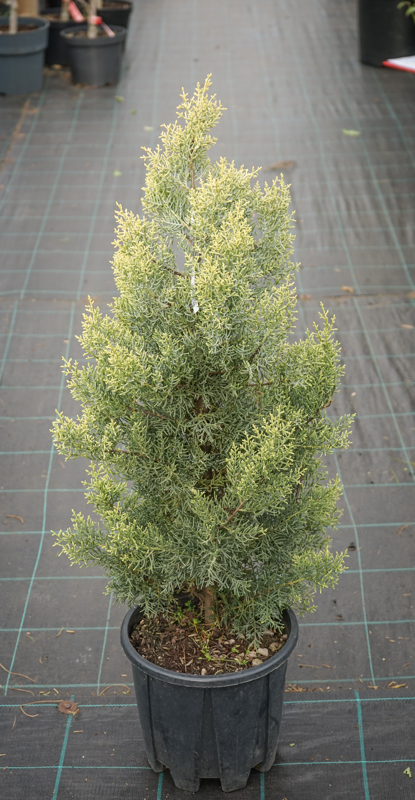 Odrůda Fastigiata Aurea arizonského cypřiše je naprostá lahůdka. Vznikla pravděpodobně jako zahradnická selekce ve Francii v druhé polovině 20. století, ačkoli přesné informace o jejím vzniku nejsou v odborné literatuře doloženy. Na rozdíl od běžné ‘Fastigiaty’ nabízí mladé výhony ve světle máslově žlutavém odstínu, který se během sezóny mění do sivě zelené, ale před příchodem zimy se chlorofyl – zelené barvivo – částečně stáhne do kořenů, takže jeho výjimečná béžová barva opět nastolí svou vládu. Roste velmi štíhle, s větvemi přitisknutými ke kmeni, a tvoří úzce pyramidální až sloupovitou korunu, která působí sošně. Jehlice jsou měkké, hladké, vonné, a kůra zůstává hnědočervená, odlupující se v tenkých plátcích. Není tak vysoký jako jeho předchůdce a jeho dospělá velikost se pohybuje mezi 4 a 6 metry v ideálních podmínkách při šířce do 2 metrů. Roční přírůstky jsou do 30 cm a keř pěkně houstne. Díky své kompaktnosti je vhodná i do menších zahrad.