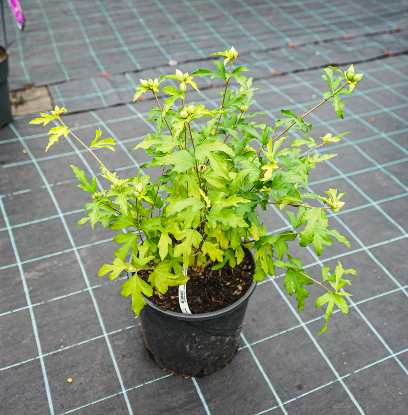 Opadavé listy jsou 5-7 cm dlouhé, trojcípé, mělce laločnaté, středně až tmavě zelené. Jako u většiny v létě kvetoucích dřevin raší dost pozdě, tak si nedělejte zbytečné starosti, že třeba zmrznul, jestliže ještě v dubnu na keři nic neuvidíte. Pokud začnou žloutnout a opadávat, je rostlina momentálně přelitá nebo se ještě nestihla prokořenit. Má dužnaté kořeny, které si dobře poradí s dočasným nedostatkem vody.