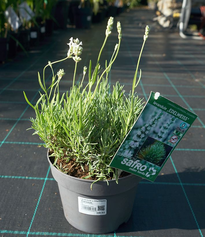 Bílá barva je pro levanduli možná poněkud neobvyklá, ale v dobré společnosti kombinovaná s jinými dokáže podtrhnout odstíny okolních kytiček, stejně jako upoutat pozornost sama na sebe svou čistotou. Vychvalovat levanduli pro její krásu a vůni je jistě nošením dříví do lesa, tak se omezíme na pár základních údajů: tato nenáročná rostlina je botanicky zařazena mezi polokeře, přesto je většinou v prodeji mezi trvalkami jako tzv. dřevnatá trvalka. Stonky jsou tenké, 40-60 cm vysoké a díky svému množství tvoří nadýchaný, uvolněný keř. Listy jsou neopadavé, úzké, sivě modrozelené v zimě a na jaře a světle zelené během léta.