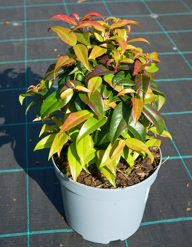 Listy jsou neopadavé, kožovité, zdravé a lesklé. Zjara raší svítivě červené a později dozrávají do tmavě zelené, což se opakuje téměř během celého léta až do podzimu, kdy se celý keř začíná barvit do různých stupňů granátově rudé až temně vínové barvy, která na keři zůstane po celou zimu až do příchodu horkých dnů jara. Na přelomu dubna a května vykvétají drobné, nevýrazné, konvalinkové květy, po jejichž odkvětu je dobré odstranit větvičky, které by tvořily semena a tím keř vysilovaly, a podpořit tak rašení nových výhonů.
