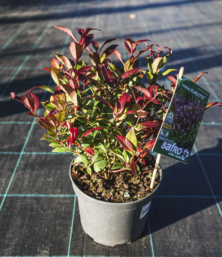SCARLETTA® patří k prvním skutečně úspěšným registrovaným odrůdám leukotoe a právem se dnes již považuje za historickou a stále hojně využívanou klasiku, protože je spolehlivá a umí zahradu doslova rozsvítit. Vznikla kolem roku 1980 a americký patent č. PP5195 získala v roce 1984. Nese neopadavé, úzce eliptické listy dlouhé přibližně 6–10 cm, pevné, lesklé a jemně zvlněné po okraji. Na jaře raší nové výhony v tlumených bronzově červených až červenohnědých tónech, které se během léta postupně uklidní do sytě zelené, přičemž náznak červeného zabarvení často zůstává patrný na špičkách výhonů nebo při okrajích listů. Největší show ale přichází na podzim: s prvními chladnějšími dny se listy znovu promění, tentokrát do zářivě karmínových a šarlatových tónů, které se postupně prohlubují do sytě vínově červené barvy. Tento výrazný zimní šat na keři vydrží po celé chladné období až do jarního rašení nových listů, takže SCARLETTA® nikdy nezmizí z očí. Roste pomalu, ročně přirůstá zhruba 10–15 cm, a přirozeně vytváří nízký, široce polokulovitý a mimořádně hustý keř, který si drží tvar i hustotu bez nutnosti řezu.