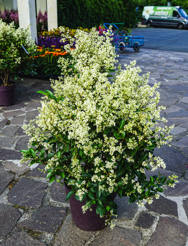Korea Dwarf je zakrslý japonský ptačí zob, který jsem si zamiloval na první pohled. Jeho listy jsou téměř stejné jako na základním druhu, jen o třetinu až polovinu menší (2,5-3,5 cm dlouhé). Jsou oválné až úzce vejčité, tmavě zelené, lesklé a přisedlé velmi blízko sebe, čímž nabízí perfektně zahuštěné větvičky tvořící sympatické, husté keříky. Začátkem června bohatě vykvétá vzpřímenými latami, které připomínají laty šeříků a dokonce i podobně voní, snad jen s příměsí jasmínu, a v porovnání s celkově drobnou velikostí keře působí dost výrazně. Laty jsou složené z drobných, krémově bílých, úzce trubkovitých květů, kvetou asi 3 týdny a po květech mohou následovat drobné, modročerné až černé plody.