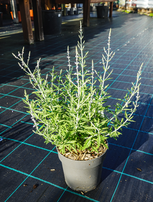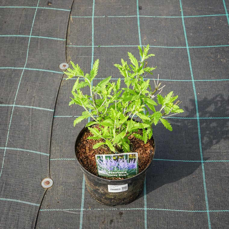 LACEY BLUE je překrásná odrůda perovskie z Anglie, jež se vyznačuje bohatostí kvetení, kompaktním habitem a atraktivními listy. Květy jsou drobné pantoflíčky výrazně inkoustově modrofialové barvy a vykvétají z fialových poupat, které se objevují již v červnu. Opravdové kvetení začíná až ve druhé polovině léta, ale díky nápadně zbarveným poupatům je rostlina atraktivní již od začátku léta a protože po odkvětu zůstávají fialové kalíšky, vypadá barevně po velice dlouhou dobu – často až do října. Květový stvol je bohatě rozvětvený a může mít až půl metru na výšku. Každým rokem vykvétá větší množství květů, takže perovskie v srpnu vypadá jako jeden velký fialový oblak. Opadavé listy jsou v mládí svítivě stříbrošedé, později sivě zelené, a přestože je jejich délka pouze 4-6 cm, svým hlubokým vykrajováním jsou dost nápadné. Stonky jsou stříbřitější než doposud vyšlechtěných odrůd. Keř obsahuje velmi vonnou silici připomínající šalvěj. Dorůstá kolem 1m do výšky a časem i do stejné šířky.