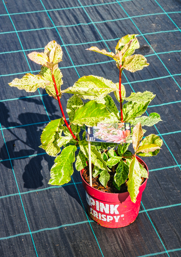 Blýskavka PINK CRISPY nabízí drama už na první pohled. Nadmíru okázale panašované bílo-zelené listy jsou neopadavé, velké, obvejčité, zajímavě zvlněné, při krajích zoubkaté a to jste ještě neviděli mladé rašení – křiklavě růžové. No, jestli tahle kytka není z plastu, tak nevím. Vážně unikátní kousek. Použijte jako menší solitér nebo vložte mezi méně výrazné keře, kde okamžitě ztropí barevný humbuk. Roste středně rychle a výborně se větví i bez stříhání. Habitus je hustý, téměř neprůhledný.
