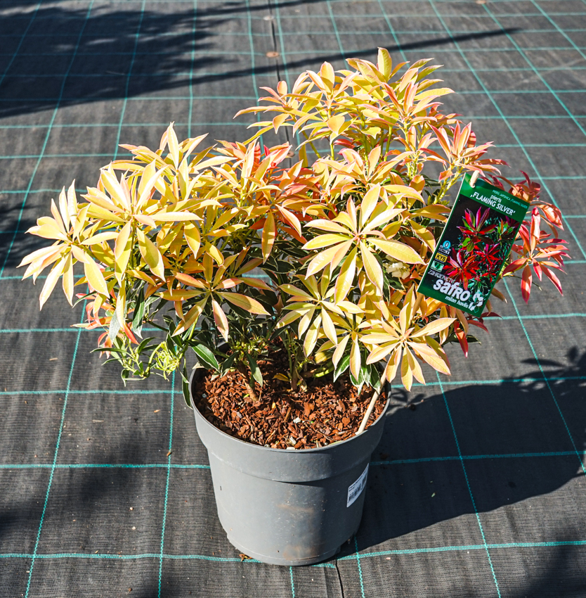 Máte rádi zářivé barvy a neopadavé listy? Pieris Flaming Silver dokáže nabídnout obojí a ještě něco navíc. Tento stálezelený keř má úzce kopinaté, neopadavé, kožovité listy, jejichž barva je trojí: v základu jsou tmavě zelené s bohatě panašovaným okrajem smetanově bílé barvy, přičemž nové rašení je zářivě sytě červené až purpurové. Tato barevná změna trvá několik týdnů, než listy dozrají do zelenobílé barvy. Ve druhé polovině léta se mohou objevit nové listy znovu a opět takto zářivě vybarvené.