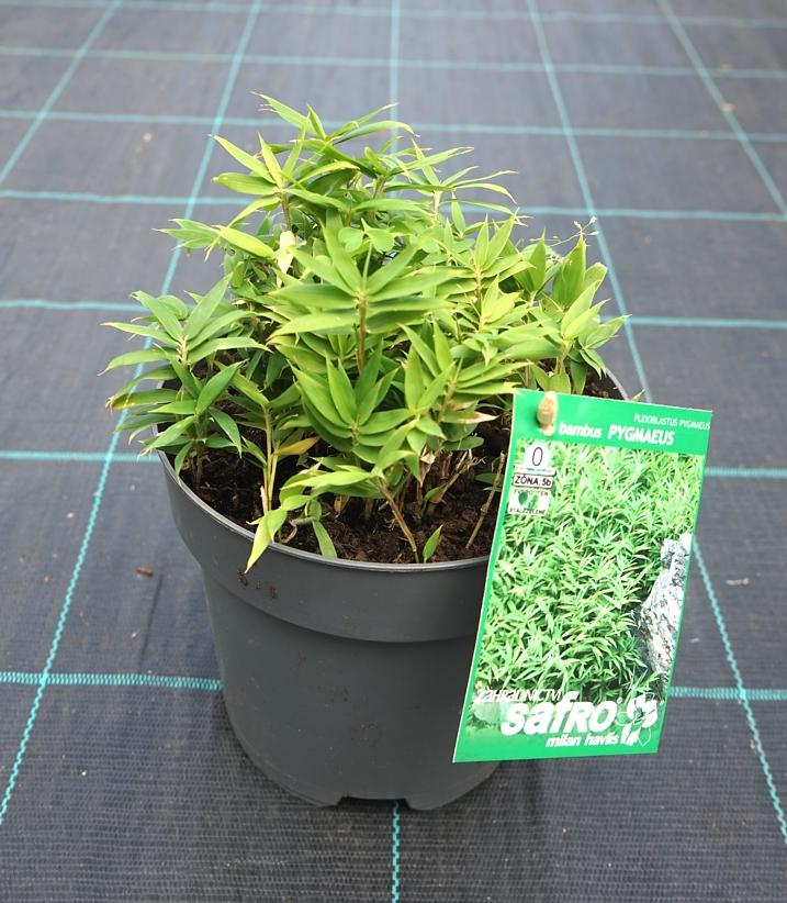 Zakrslý druh bambusu pygmaeus se řadí k tzv. trávníkovým bambusům, což znamená, že se jedná o rychle a hustě se rozrůstající trvalku, která dokáže během 10 let vytvořit pěkný půdní pokryv na ploše o rozloze až 3x3 metry. Nese asi nejmenší listy z celé skupiny. Jsou svěže zelené, neopadavé, úzké a hustě obrůstají stonky o výšce 20-40 cm. Pochází z Japonska.