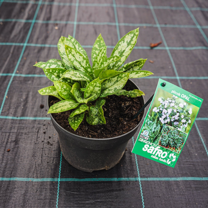 OPAL je atraktivní plicník se strakatými listy a něžnými, světlounce modrými a růžovými, až téměř bílými květy. Nalezla jej roku 1986 Elisabeth Susan Cupitt ze zahradnictví Blooms of Bressingham jako náhodného semenáče mezi mnoha rostlinami původního druhu. Kvetení u nás začíná během prvních teplejších dnů jara, obvykle v první polovině dubna a pokračuje asi měsíc. Květní stonky jsou krátké, mají jen kolem 20-25 cm na výšku a objevují se na pozadí široce kopinatých, středně zelených listů se stříbřitými skvrnami, které po odkvětu dozrají do dvoj- až trojnásobné velikosti a list se stává více stříbřitým než zeleným. Kvalitu listů umocníte sestříháním rostliny ihned po odkvětu až k zemi, aby si vytvořila listy nové, které jsou při mírných zimách neopadavé. Patent č. PP12931 byl vydán roku 2002.