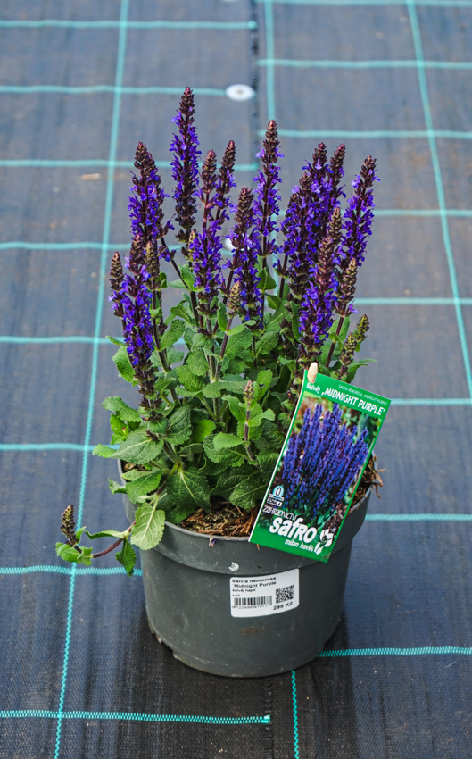 Midnight Purple nese tmavě modrofialové květy na temně modrých, krátkých stoncích o výšce jen mezi 20 a 30 cm. Květy jsou hustě nahloučené v klasovitých květenstvích a vykvétají od konce května do začátku července. Ve druhé půlce léta sporadicky remontují. Květenství jsou výrazně oddělená od listů, takže vypadají jako malá kytice napíchaná do záhonu. Listy jsou 4-5 cm dlouhé, středně zelené, oválné až široce kopinaté a výrazně vrásněné. Rostlina je kompaktní a hustá a nevysoká. Nevyžaduje žádnou péči, ale po hlavním kvetení ji můžete ostříhat až k zemi, aby znovu narašila do nového trsu s pěknými, zdravými listy a novými květy.