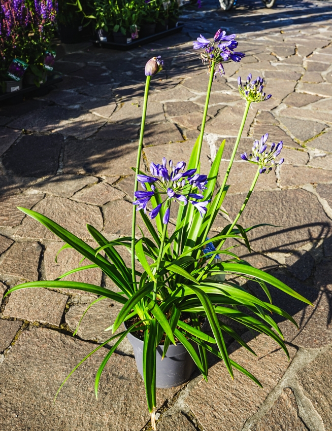Grow agapanthus in fertile soil with excellent drainage to prevent root rot over winter. From late spring to the end of summer, the plant benefits from regular feeding and occasional watering, although its fleshy roots allow it to tolerate short dry spells. In Mediterranean climates, it is a beloved summer feature in both containers and garden beds. In temperate regions, it excels in summer compositions near pools and terraces, where the season lingers longest. Good news: it is not favoured by slugs. For winter protection in zone 7, a layer of dry bark or leaves at the end of autumn is sufficient, but in colder areas with harsh winters, a thicker mulch and waterproof cover are recommended. At the end of winter, as soon as the risk of severe frost has passed, remove the cover and half the mulch, then wait for true spring (March/April) to uncover the rest, clear away old foliage and allow the plant to re-emerge. Tested hardiness is -17 °C (USDA zone 7) and it is believed to tolerate even lower temperatures.