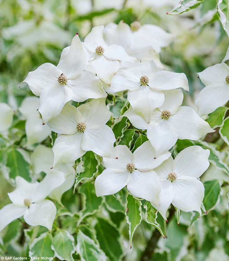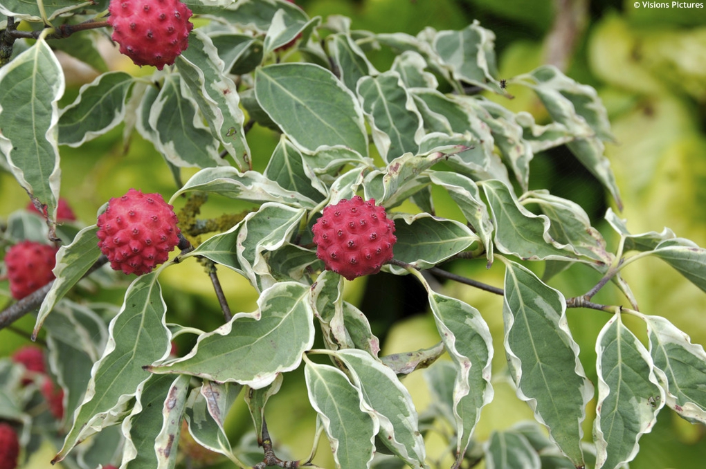 SAMARITAN® Japanese dogwood is easily recognized from a distance. Its variegated foliage steps out of any hedge or landscape. The deciduous leaves are acuminate, ovate, medium green with white or near white margins, and turn brilliant shades of crimson and burgundy red with some gold hues in autumn. They droop just like pear tree leaves.