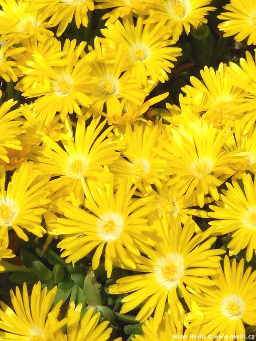 Delosperma is a genus of low-growing, perennial succulent plants in the family Aizoaceae, native mainly to the mountainous and semi‑desert regions of southern Africa, where it inhabits rocky slopes, crevices, and places where water disappears before it has a chance to soak in. The genus was described in the early 20th century by the British botanist Nicholas Edward Brown (1849–1934), who noticed the tiny, glistening cells on the surface of the leaves—features that gave the plants their name, derived from the Greek delos ("conspicuous") and sperma ("seed"). Iceplants are characterized by their fleshy, evergreen leaves capable of storing water for long periods, and by their strictly mat‑forming, creeping habit, which allows them to create dense, low carpets. During flowering, these inconspicuous cushions transform into a blaze of daisy‑like blooms that open only in full sun and rank among the most rewarding ornaments of dry, heat‑exposed sites.