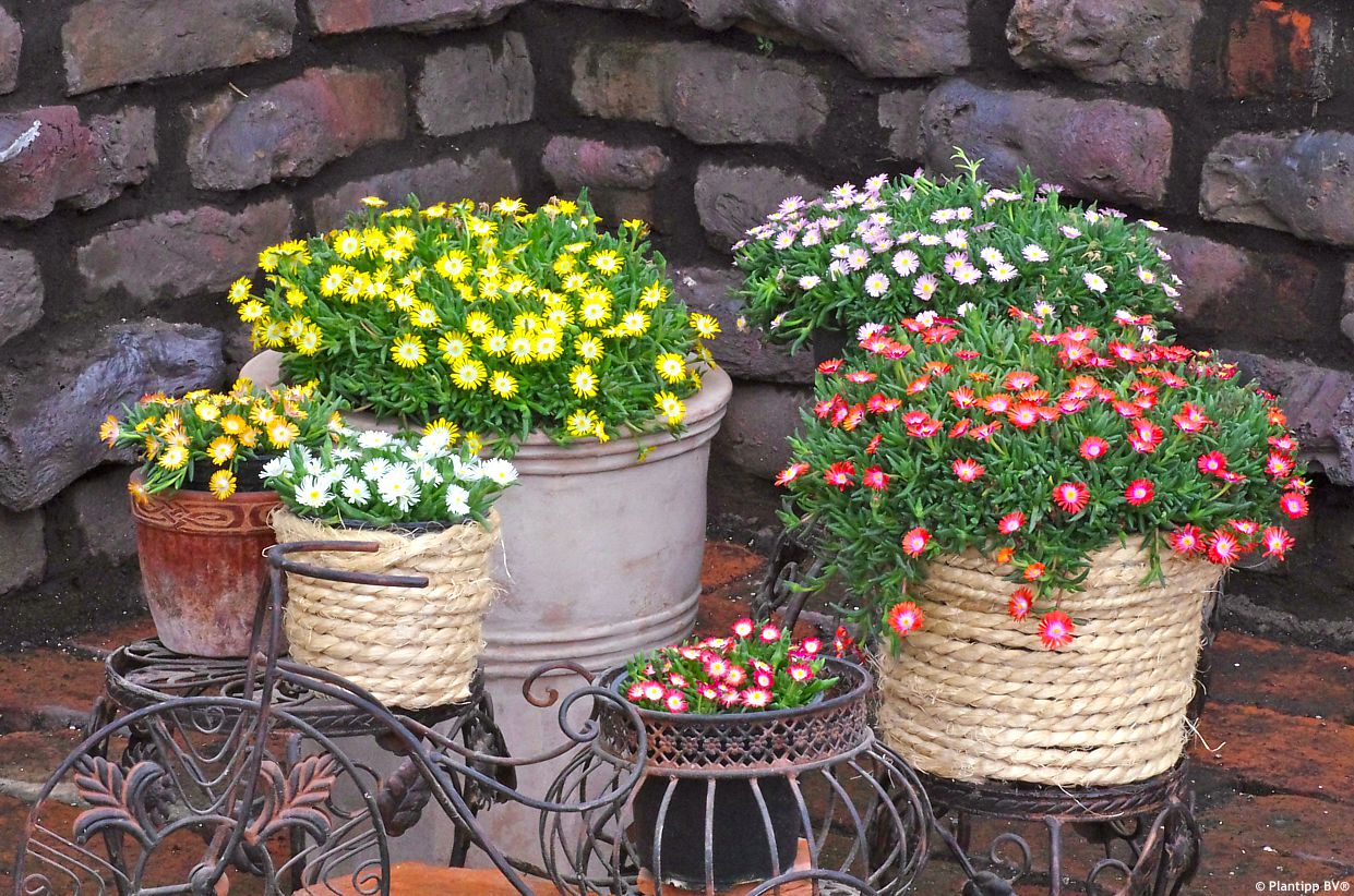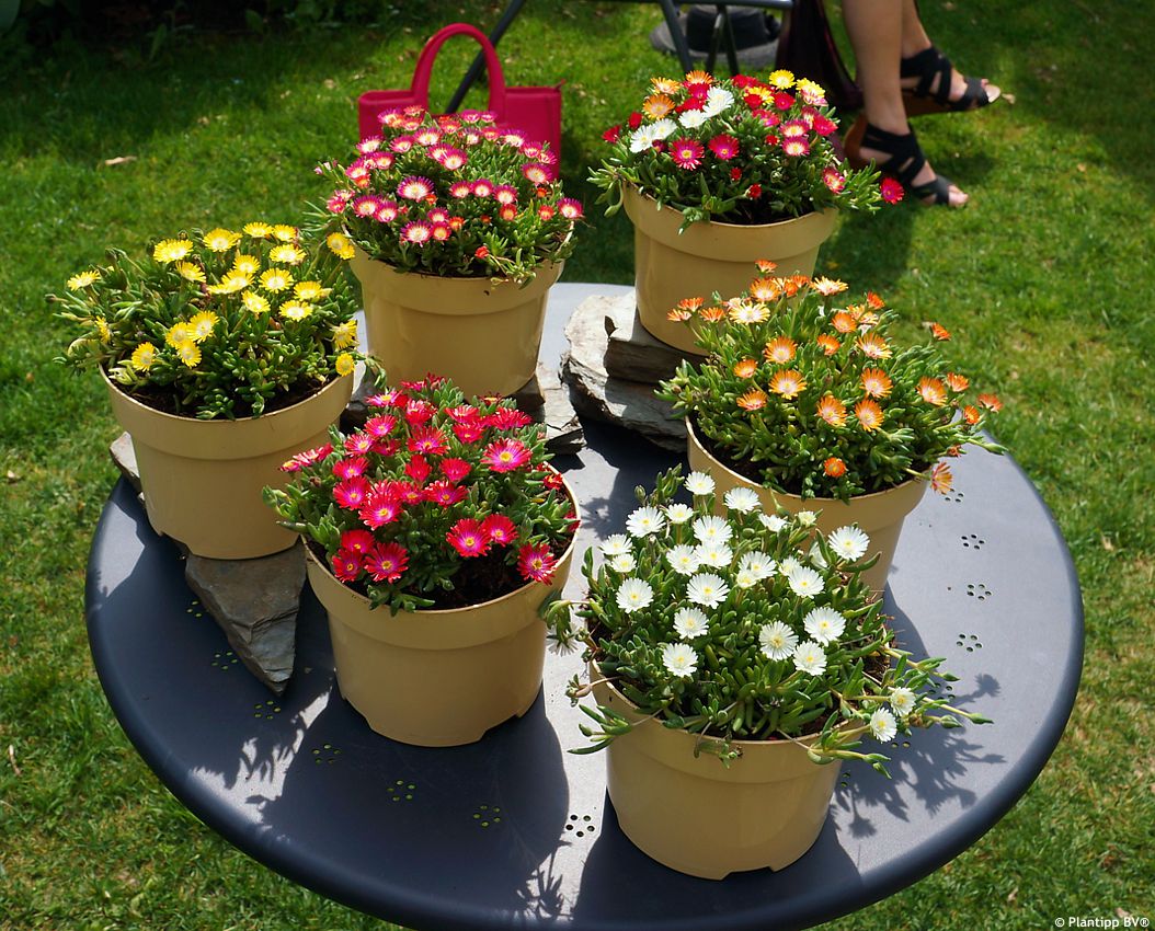 Ice plants are primarily grown in rock gardens and similarly styled plantings – among stones, in ornamental gravel, or in the crevices of dry stone walls – and combine well with perennials that share similar requirements but flower at different times, extending the overall attractiveness of the composition. They look particularly good among houseleeks and Lewisia, and can also be combined with low, compact drought‑tolerant grasses such as fescues. Stonecrops offer a contrasting palette of foliage colours, while ground‑covering pinks provide a different flower form. For those who enjoy herbs, the lowest‑growing types such as thyme or savory are especially suitable.
