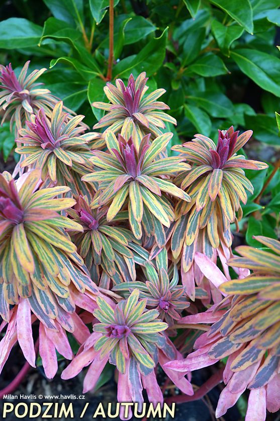 Euphorbia amygdaloides and its hybrids are woody perennials typical of the warmer, though not arid, regions of the Caucasus and Turkey. They tolerate high summer temperatures but require more moisture than the drought‑adapted vegetation of southern European rocks and plains. This explains their great popularity in Great Britain, where the consistently high humidity allows spurges to thrive. In our continental conditions, Galaxy Glow does best in moderately moist but well‑drained soil of any pH. It should be kept lightly moist for the first few months, but beyond that they will rarely need more water than natural rainfall provides, especially if mulched. Feeding before flowering, and again at the end of summer is beneficial, though not essential. Ascot Rainbow is reliably hardy to at least –25 °C and requires no winter protection. It is not suitable for outdoor planters, as it dislikes sudden fluctuations in temperature and moisture.