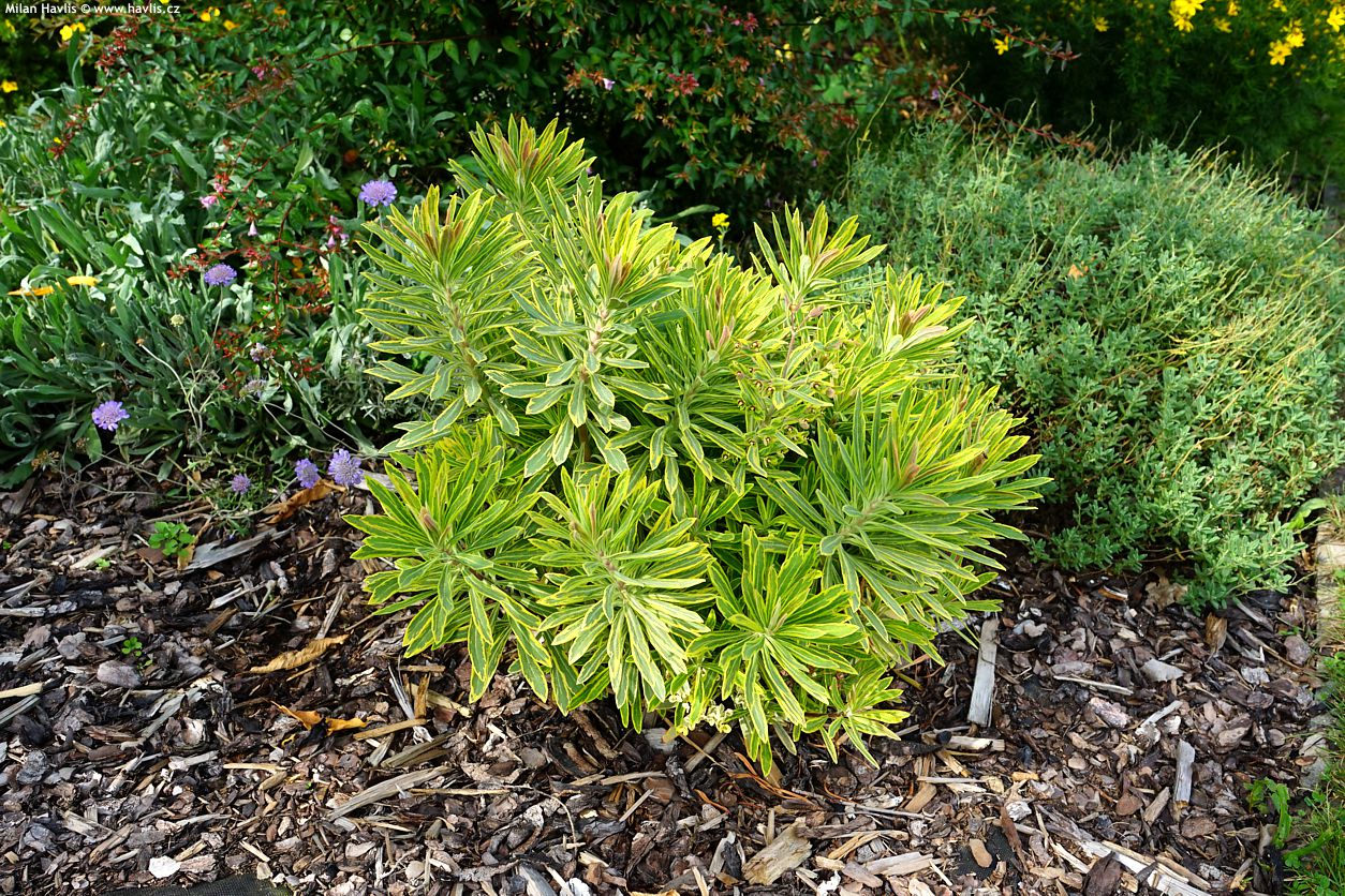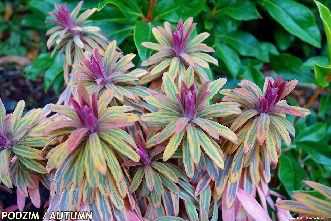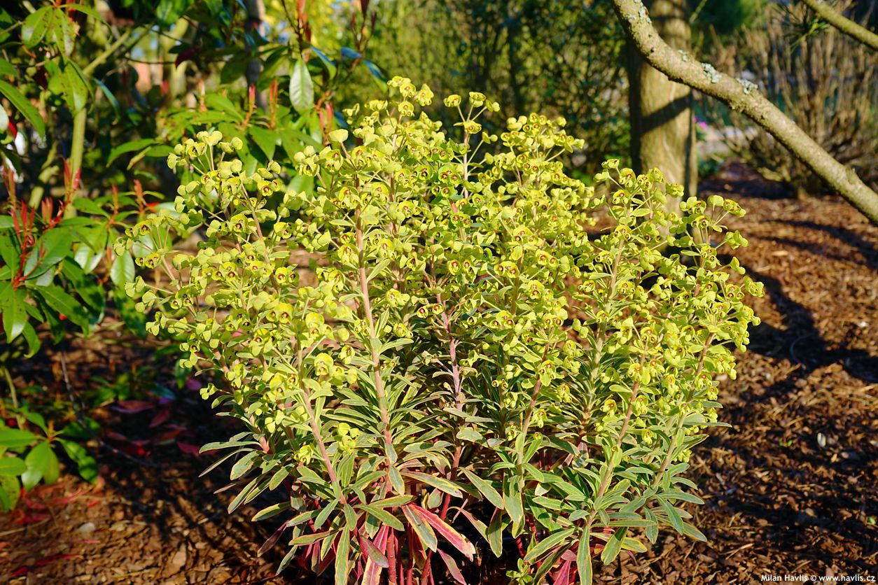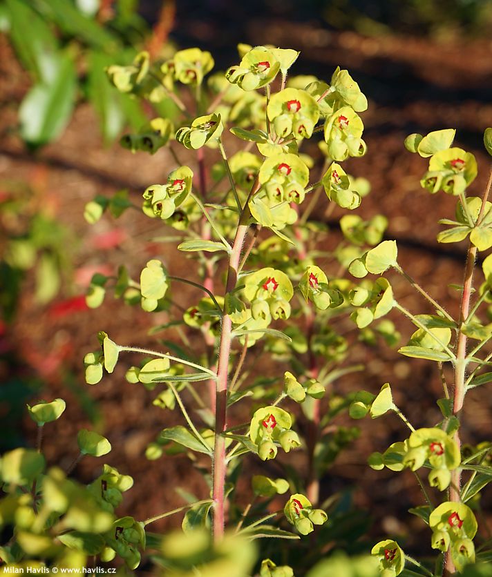 ‘Ascot Rainbow’ forms a compact, dome-shaped, slightly spreading habit with sturdy red stems, reaching up to 90 cm in height and 80 cm in width. Flowering is abundant. From spring into summer, the plant produces tubular flowers in cream, lime, green, and red, so distinctive that for one or two months they completely transform the visual character of the shrub – or rather subshrub, since these spurges are botanically known as semi-woody perennials. The cultivar is protected by patents PP21,401 (USA – 2010) and 68088 (Europe – 2011).