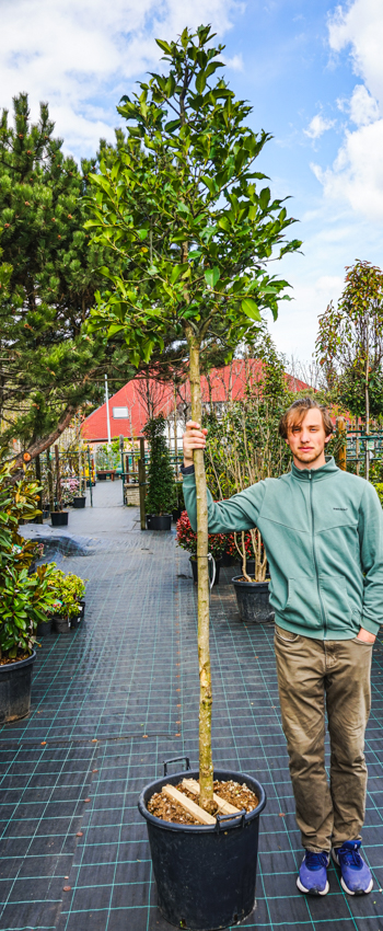 Tree forms of evergreen woody plants are becoming more and more popular. They can offer good screening at a desirable height blocking views from neighbouring windows if privacy is why you look for an evergreen tree. As every standard tree it needs a good support to protect the stem from moving, especially in wind. It can be removed after 3 years if the tree is established well. There is usually a bamboo stick attached to the tree trunk when you buy the plant. It needs to be removed before you tie the stem into your new support.
