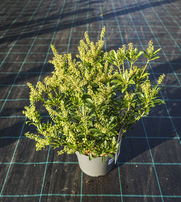 Ericaceous plants, among which pieris belongs, require soil that is light, acidic, and constantly moist but not wet. If your garden soil is too heavy do not dig a hole at all but make a raised bed. Use a good mixture of peat, fine bark chips, and leaf mould. Keep the soil moist by mulching. Slow-release fertilizers for acid-loving plants are advised. Hardy to about -27 °C and suitable for year-round cultivation in planters with good drainage (no saucers).