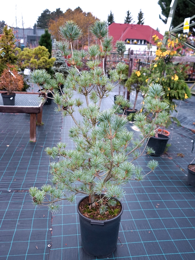 Vanderwolf’s Pyramid is probably the most commercially successful variety of Rocky Mountains white pine. It was introduced by the Vermuelen Nursery from New Jersey, USA, in 1972, and named after their general supervisor Rein. W.Vanderwolf. It has narrowly columnar habit and grows faster when young, slowing down as it gets older, beginning to form a teardrop shape. It is usually quite symmetrical without pruning. The needles are 5-9 cm long but not pendent, clear silvery blue. The plants keep them for 4-5 years and do not usually replace them by new foliage.