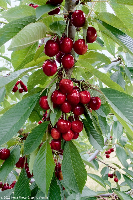 Cherries require full sun, deep, fertile, and well-drained soils with a slightly acidic to neutral reaction, regular watering during dry periods, and balanced fertilisation without excess nitrogen. After planting, a strong support is essential – a single pole is sufficient for young trees and half-standards, while standards require a tripod support for at least three years. During this period, keep the soil around the roots free of grass and weeds; even later, a clean soil surface is recommended. Cherries generally develop a strong, often shallow-spreading root system that provides stability and efficient water uptake, but may disturb paving, paths, or low walls if planted too close to built structures. The cultivar is hardy to at least –29 °C, making it suitable even for colder regions of Central Europe.