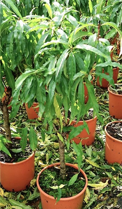 Bonanza is a dwarf variety of peach with excellent fruit. It has profusion of typical peach-like, bright pink flowers that are clustered along short branches in a dense plant. The leaves are mid green, semi-glossy, narrow and elongated, and not much smaller than on a classic peach tree. Extreme density of leaves on a dwarf crown creates an amazing appearance.