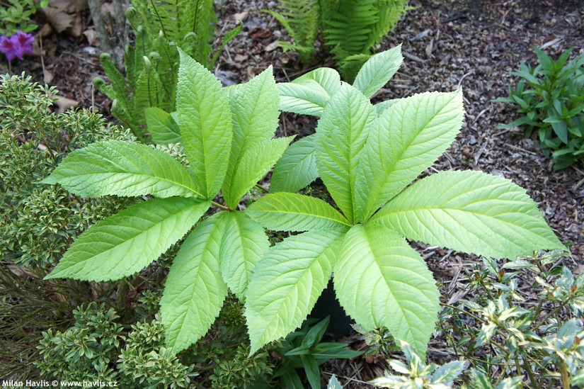 Rodgersia is a majestic looking perennial for lovers of dramatic shapes and sizes. Elderberry rodgersia leaves are composed of 7 (exceptionally 6), large, broadly obovate, shallowly veined leaflets with heavily serrated margins. They are light green with copper tones in early spring, turning rich grass green in summer. Unlike chestnut-leaved rodgersia where the leaflets grow from the same spot around the very top of the leaf stalk, leaflets of this species are borne with minor distance along the stalks.