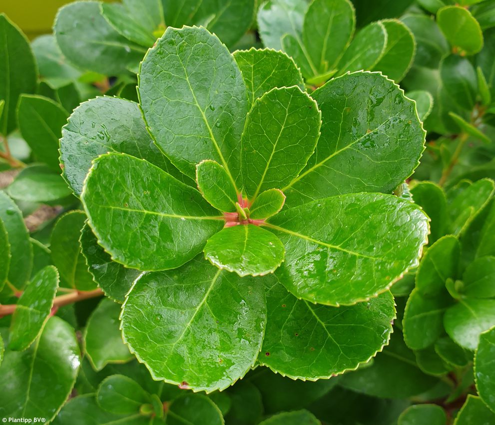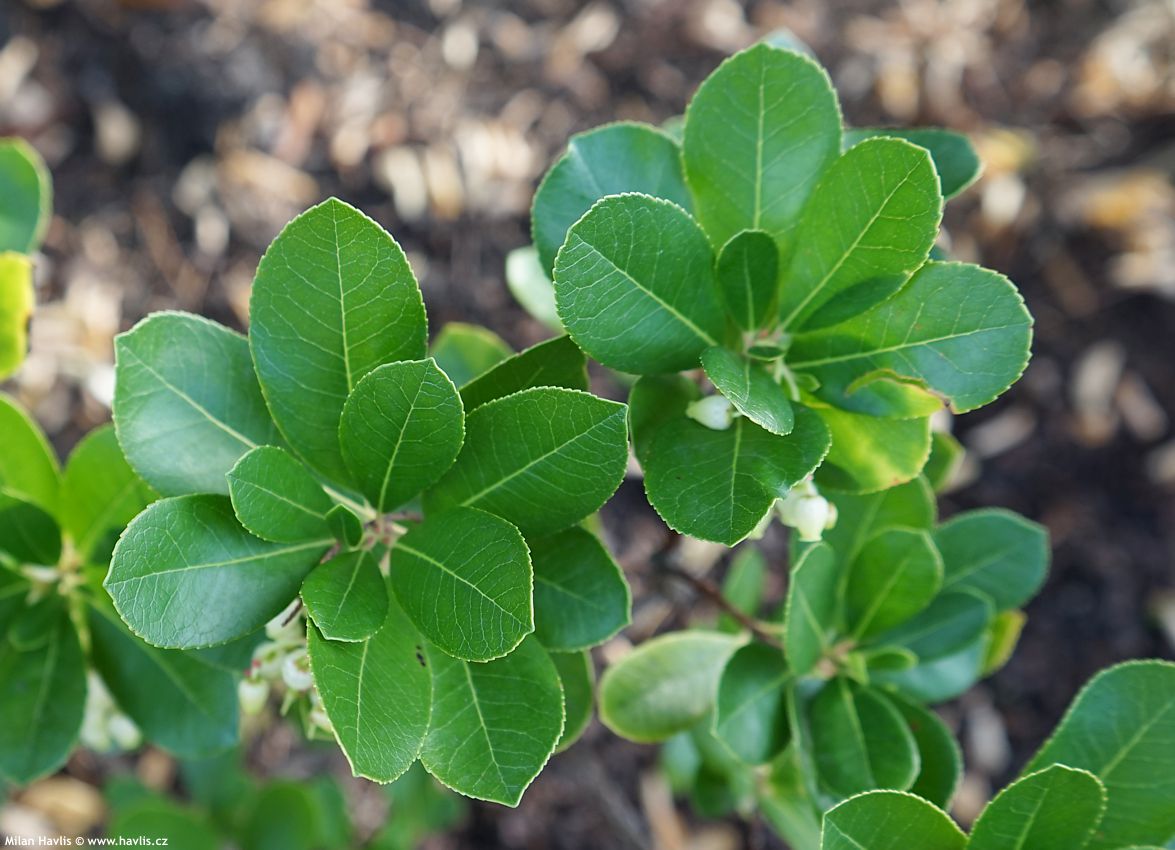 Listy této planiky jsou totiž výjimečné. Jsou stálezelené, hodně široce obvejčité, takže mohou u konce vypadat až kulatě a jejich žilkování, věřte nevěřte, připomíná písmeno Y vzhůru nohama, přesně jako v symbolu hippie. Jsou 3-5 cm dlouhé, kožovité a svěže zelené. Větvičky jsou zpočátku červenavé, později přecházejí do teplé hnědočervené, což dodává rostlině další vrstvu elegance. Habitus je kompaktní, téměř kulovitý, s hustým větvením. Roste pomalu až středně rychle – roční přírůstky se pohybují kolem 15-20 cm. Běžná výška v dospělosti je 1,5–2 m, šířka přibližně 1,5 m, takže se hodí i do menších zahrad nebo jako výrazný prvek v předzahrádce.