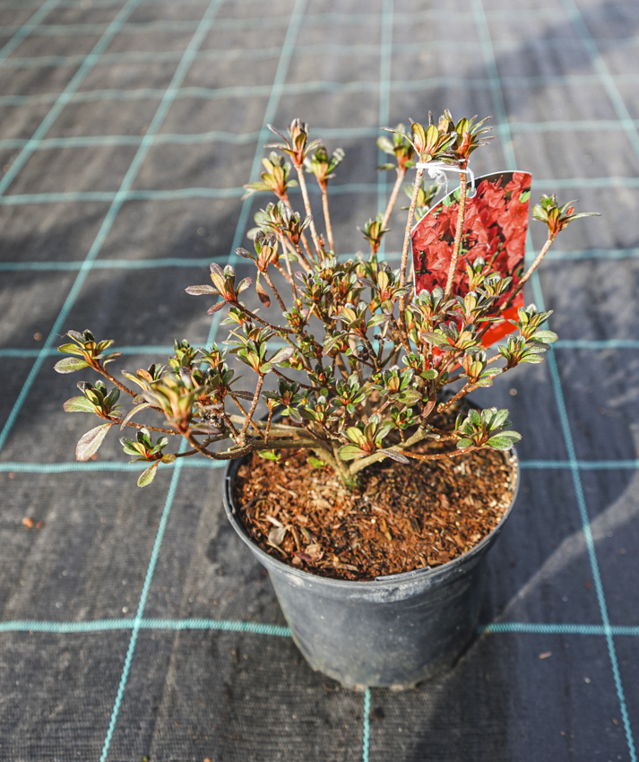 Mezi červeně kvetoucími japonskými azalkami najdete i tuto, jménem Fridoline, která nabízí zářivě červené květy střední velikosti: 4-4,5 cm široké. Kvete v pozdním jaro – od konce května do přibližně poloviny června. Roste pomalu a spíše polštářovitě, při zemi. Vyšlechtil Hans Hachmann v roce 1987.
